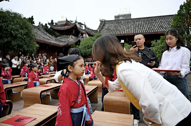 这场特殊的启蒙仪式,是从“正衣冠”开始的,在礼仪师的指导下,小朋友们互相整理衣物,寓意着"先正衣冠,后明事理”的道理。