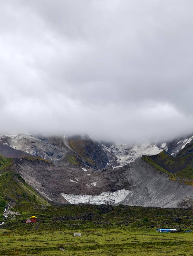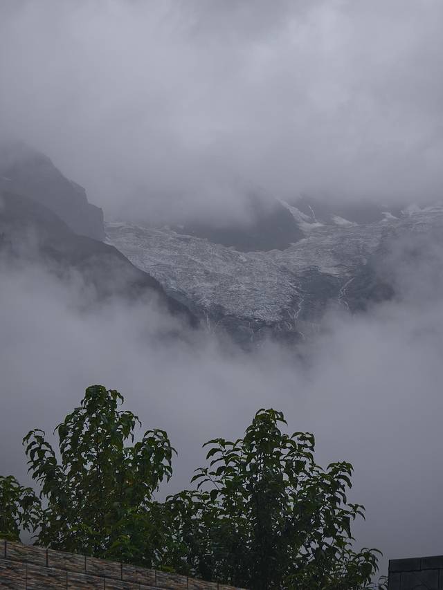 在浓雾下依稀能看到冰川的身影。