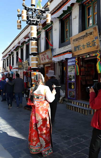 街道两旁金碧辉煌的楼宇是老凤祥西藏总店。