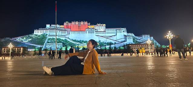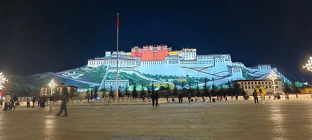 在无边墨色的夜空背景下,布达拉宫被灯光精准地雕刻出来,通体散发着温润而恢弘的金光
