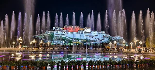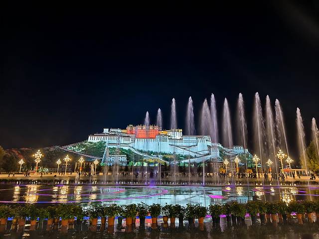 喷泉的灯光随着音乐变换着色彩,这水中起舞的宫阙将成为你对拉萨最梦幻的记忆。