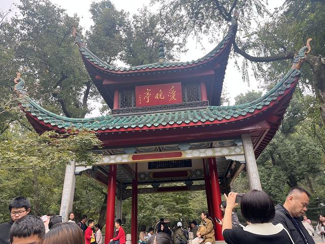 循着石径深入,心中默念“爱晚亭”的名字,脚步不自觉地加快。当那座闻名已久的朱漆亭阁终于闯入视线时,时间的流动仿佛瞬间缓慢下来。它静静地矗立于一泓不大的清潭之上,背后是连绵起伏、色彩浓烈的群山背景板。四条粗壮的方形石柱稳稳支撑起八角的攒尖顶,亭角高翘,气势雄浑中不失秀雅。那鲜亮的丹砂红在下午柔和的光线下,显得格外庄重又温暖,像是山间跳动的一颗朱砂痣。亭檐下的描金彩绘有些许剥落,反添了古亭历经风霜的厚重气韵。亭前潭水清澈见底,倒映着蓝天、飞檐和枫影,虚虚实实,光影交错,自成一副流动的风景画。