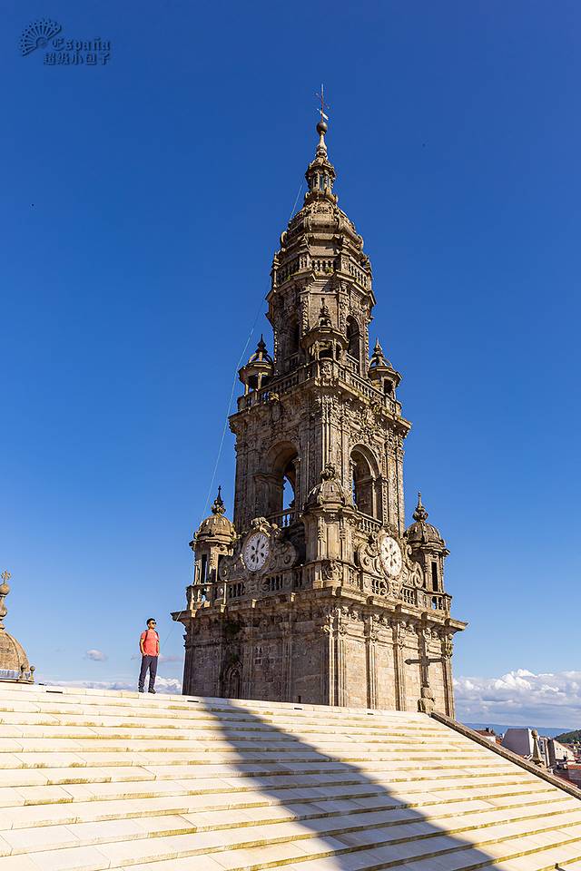 参观圣地亚哥大教堂最有特色的体验,莫过于亲自爬上屋顶平台了。这里位于大教堂面对广场的奥布拉多伊洛立面正后方。如果把“奥布拉多伊洛立面”比作教堂的正脸,那么我们相当于站在它的肩膀或是后背的位置。