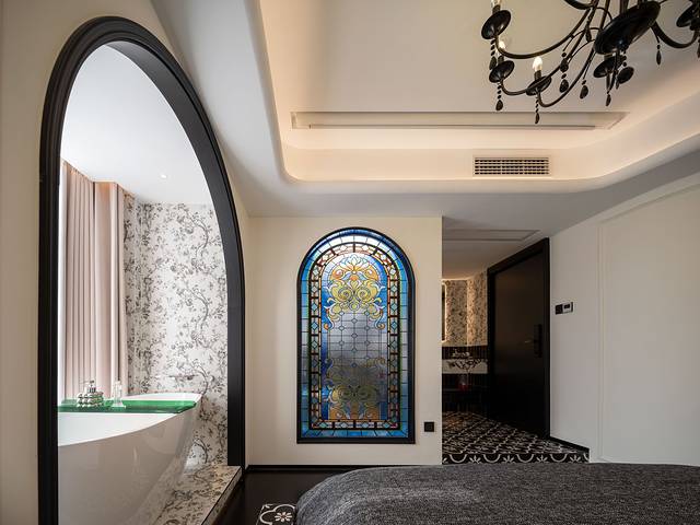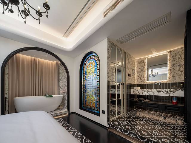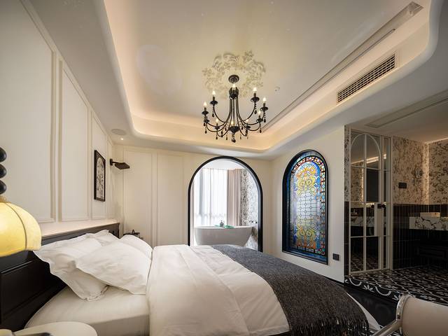 推开房间门的瞬间更绝!180° 江景落地窗直接把赣江风光框成了画,白天能看到波光粼粼的江面,到了晚上滕王阁的灯光亮起来,坐在窗边喝杯小酒,氛围感直接拉满。房间里的装修是我超爱的法式风,米白色的沙发、复古的落地灯、墙上挂着的油画,连抱枕都是精致的蕾丝花边,随便一个角落都能拍出氛围感大片,我和闺蜜在房间里拍了快 1 小时都停不下来!