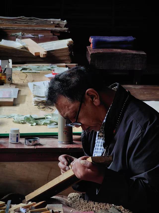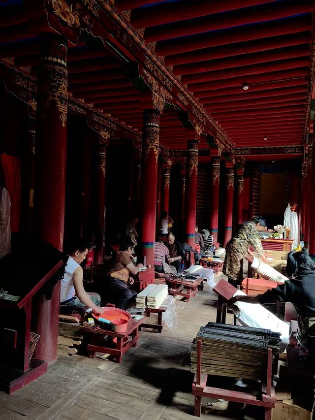 再到德格,大概下午3:40到,直奔德格印经院,注意:4点就不允许游客再进入了,要安排好时间,下午也约不上讲解了。但幸运的遇上了单位的参观学习,蹭到了讲解。德格印经院是中国最大的藏文印经院,也是世界上唯一一个依然用雕版手工印经文的地方,建于清雍正年间,距今有300年历史。寺院坐北朝南,整栋建筑采用回字形结构。德格印经院被誉为“藏文化大百科全书”,目前完整保持雕版32万余块,包括各大类学科,甚至是印度早已失传的典籍也收藏于此,令人叹为观止。二楼是印经院核心区域:藏版库。一排排版架整齐排列,经版分门别类地插满了版架,为保护珍贵的木刻经版与佛经典籍,上百年来印经院不通电也不用火烛。印经人每天熟练做着自己的工序:印经-洗刷-晾晒-核对-修缮等。这里印经用的纸是狼毒纸,这种纸含有轻微毒性,才能保住不被虫蛀鼠咬。为了找到合适的板材来雕刻经文,土司也是在上百种木材中找到了红桦木,经过多道工序,才能避免后续的变形和开裂,才让百年后的我们依然能看到这壮观的一幕。来印经院参观,不仅欣赏它的印刷瑰宝,更重要的是了解藏文化的历史、人文以及信仰。