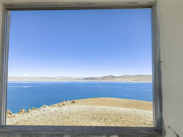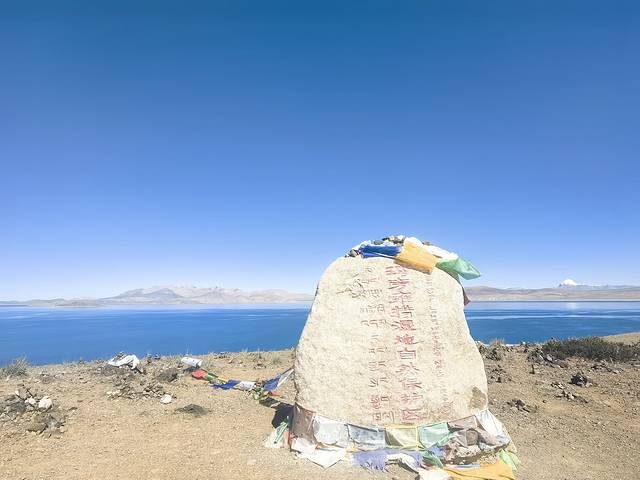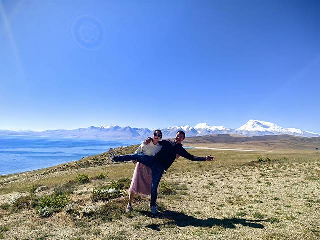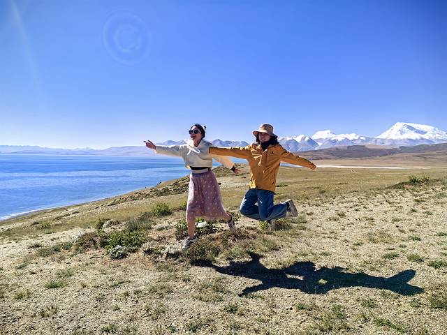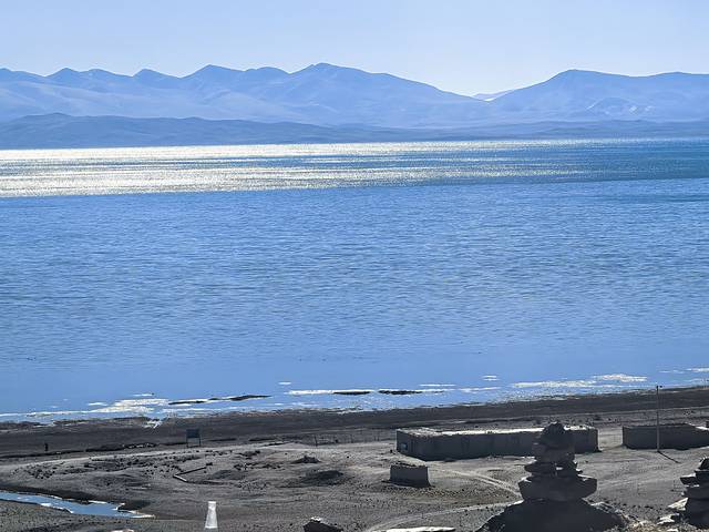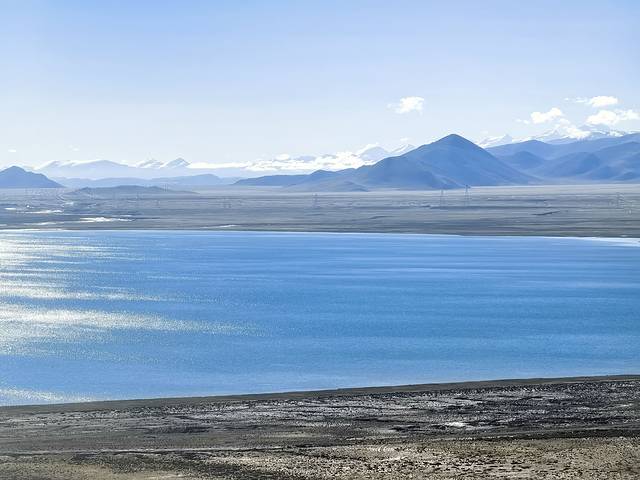 继续导航[玛旁雍错]观景台,可步行到湖边,风佛过玛旁雍措湖面, 波光粼粼太美了,还能拍到与[纳木那尼峰](也称“女神峰”)同框,不赶时间的话,真想搬两把露营椅在湖边发呆、聊天、沉思、享受、拥抱神山圣湖蓝天白云阳光空气,巴适得很。