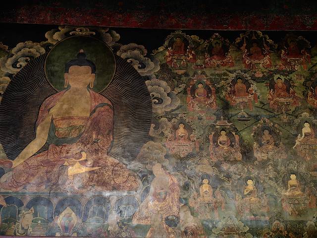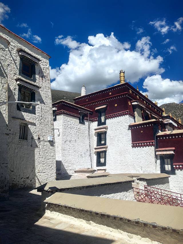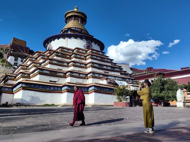 再出发江孜[白居寺],到时已是下午5:10,买票入,本来想请讲解,门口卖票的喇嘛说最近寺院喇嘛过节休假了,几乎都不在寺里,想蹭讲解,发现都是外国团队。只能自行参观了大殿,再去白塔。感受到了独一无二的存在“一座寺,藏三派;一座塔,纳十万佛”。罕见的“三派共存“格鲁派、萨迦派、夏鲁派”和谐共处;主殿措钦大殿内光线昏暗,廊壁上斑驳发黑的壁画,让人嗅到六百多年前的古老气息;大殿中央的三世佛是铜鎏金的,其他所有佛像均为泥塑,造型精美,油亮漆面闪烁着金属的光泽,让人很难相信他们是土质泥胎;白居塔共9层,高32米,共77间佛殿,108个门,不仅仅是一座塔,更是一座立体寺庙,一个佛国的宇宙模型。因为时间关系,塔在下午就关闭了上层,我们仅仅是逛完第一层,每推开一扇扇小门,仿佛打开一个个神秘的匣子,每间殿内的塑像、壁画都各不相同,光影从狭小窗口洒入,照在斑驳壁画上,那一刻,时间仿佛凝固了。