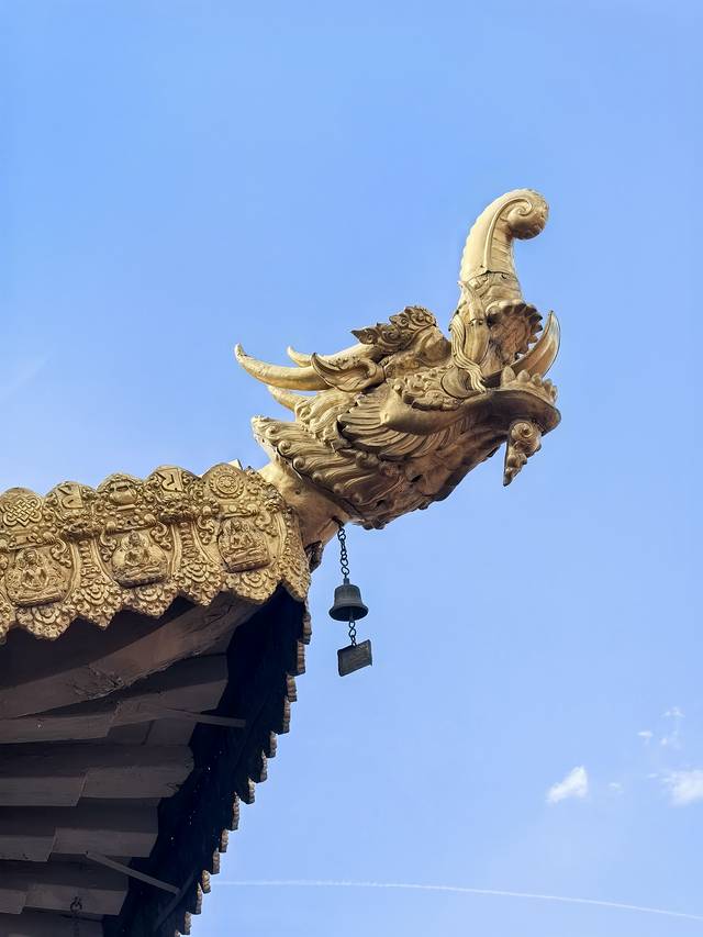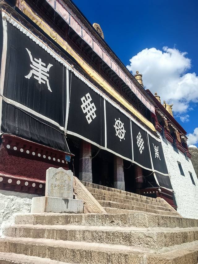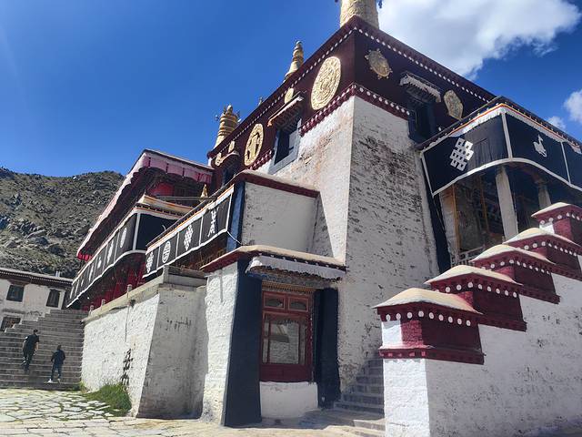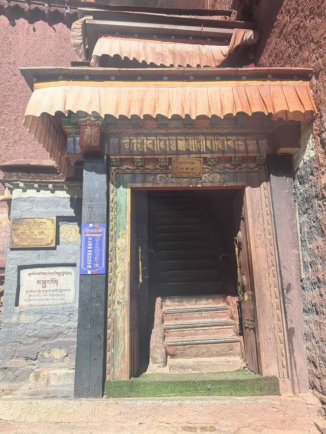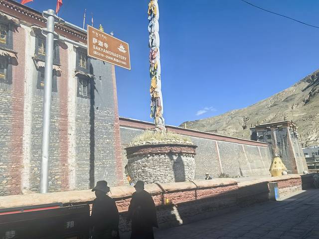 早上起来逛[萨迦寺],曾是元朝时期西藏的政治、宗教、文化中心,对西藏的统一和融入中国版图起到了重要作用。寺院里面喇嘛都很友善,会主动打招呼,9点到的,已经诵经完了,有点可惜。买完票60/人,问是否有讲解,门票处的一个喇嘛问了可能没有,就自己请假出来带我们逛给我们讲解,十分感激。了解萨迦寺南寺由萨迦班智达和八思巴扩建,形制宏伟,被誉为“雪域第二敦煌”。其城墙涂有红、白、灰三色,分别象征文殊、观音和金刚手菩萨,因此萨迦派又被称为“花教”;保存有大量贝叶经、金汁书写的佛经以及元代以来的壁画唐卡,整面整面墙的佛教经书和历史文献,直击心灵;有幸听到了仅存2个,其中一个白海螺吹响,也是萨迦寺的镇寺之宝之一,以及亲眼看到莲花生大师的“帕巴鲁格肖热像”、文殊菩萨像和“扎曼”,都是寺内宝藏。萨迦寺不仅是一座寺院,更是藏传佛教文化艺术的博物馆,能感受到给我们讲解的小喇嘛的骄傲。珍宝馆需额外买票20/人。逛完后,又去爬了解脱梯,看起来不高,爬上去还是有点喘。