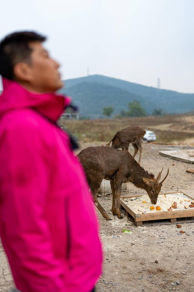 再往前走,隐约听到 “窸窸窣窣” 的咀嚼声,我们加快脚步,眼前的景象瞬间让人心都软了:十来只梅花鹿围在石制投喂台旁,有的低头啃着胡萝卜,有的卧在草地上晒太阳,还有两只小鹿追着玩闹,偶尔用脑袋蹭蹭彼此。我们赶紧拿出提前切好的胡萝卜条,刚放在投喂台上,一只毛色光亮的梅花鹿就凑了过来,它的眼睛圆溜溜的,吃胡萝卜时嘴巴一动一动,偶尔还会抬头看我们一眼,一点也不怯生。