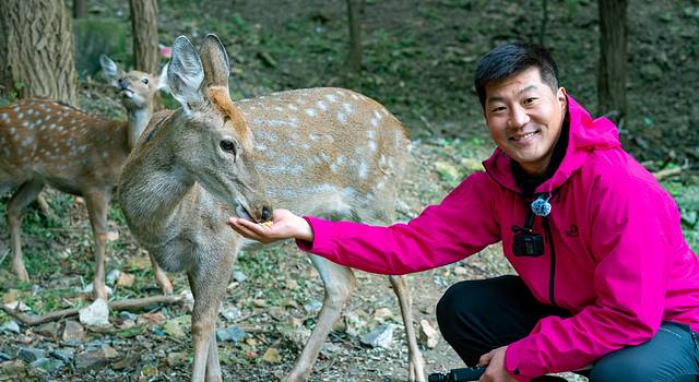 “这里的鹿都习惯游客了,每天来喂的人多,它们知道咱们没有恶意。” 旁边一位提着竹篮的阿姨笑着说,“里面还有两个投喂点,人少,你们可以去那边拍,光线更好。” 我们跟着阿姨的指引往里走,果然在树林深处又遇到几群鹿,有的在啃树叶,有的在低头喝水,阳光洒在它们的斑点上,随手一拍都是治愈系画面。