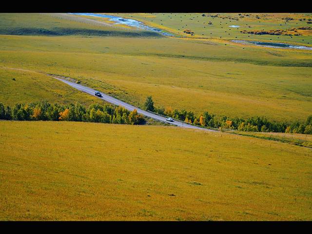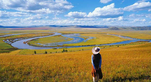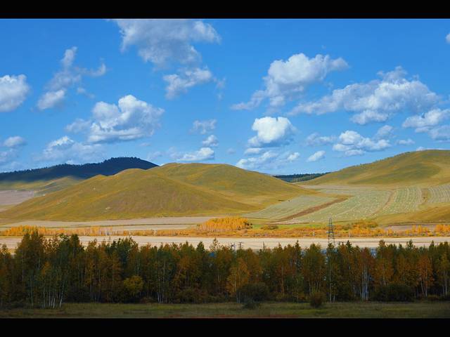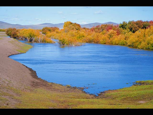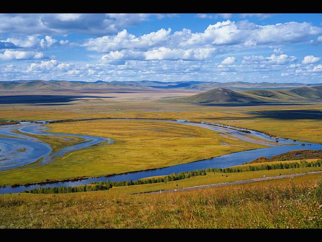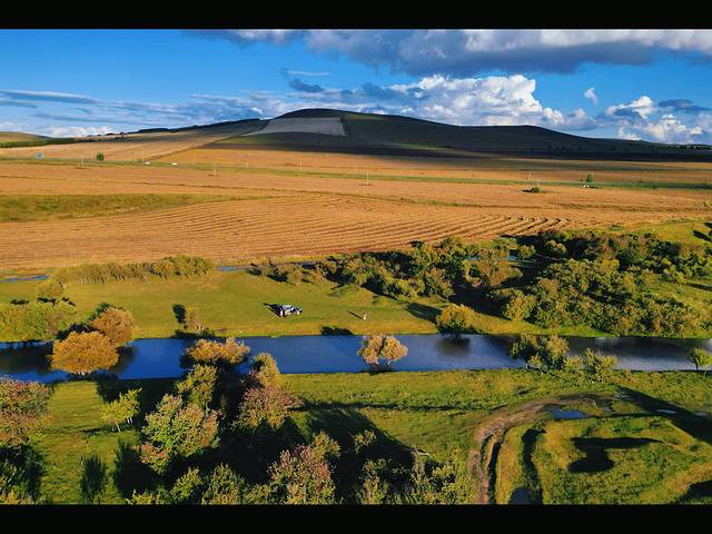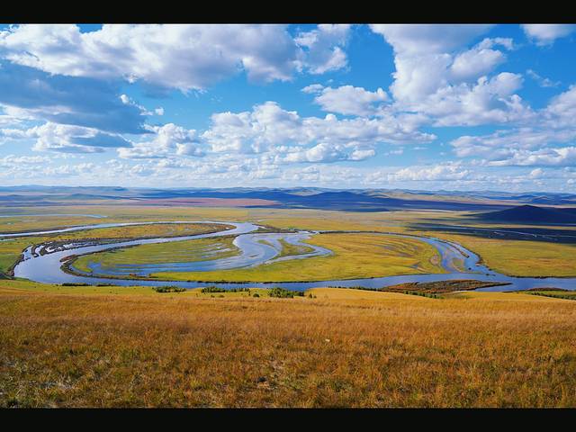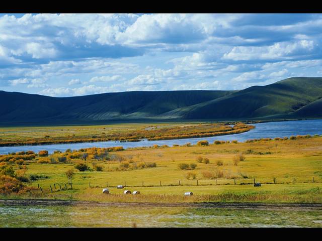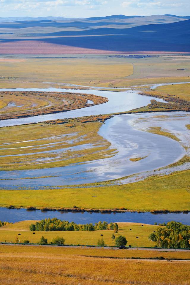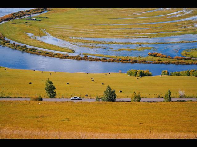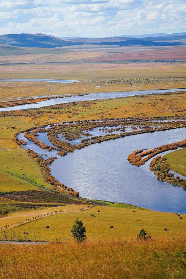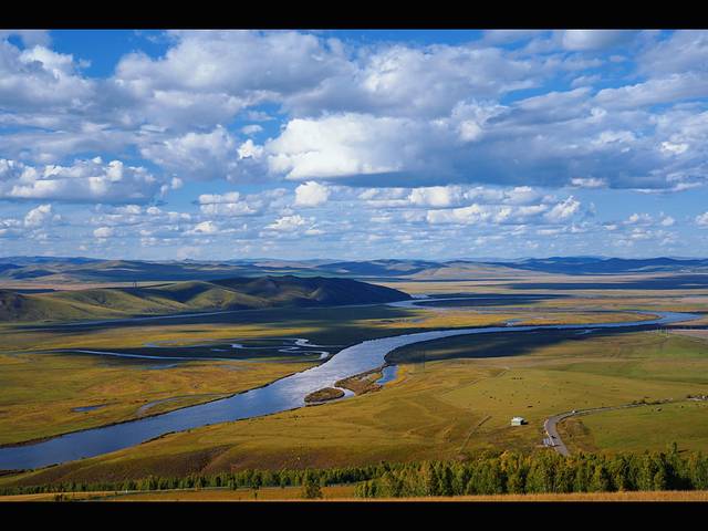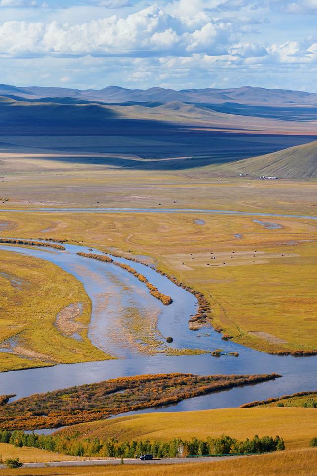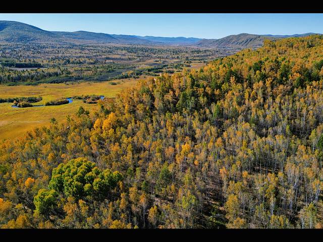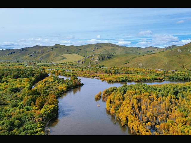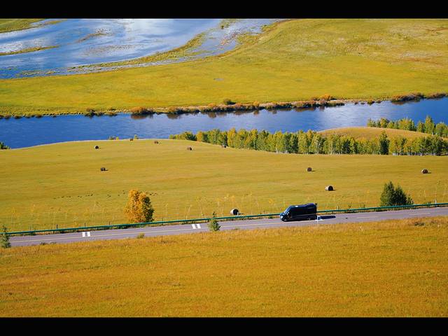 这里正处于森林草原过渡带,金黄的草场与碧蓝的河水交织,景色非常上镜。
