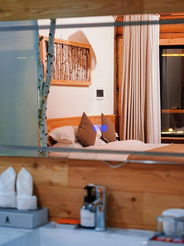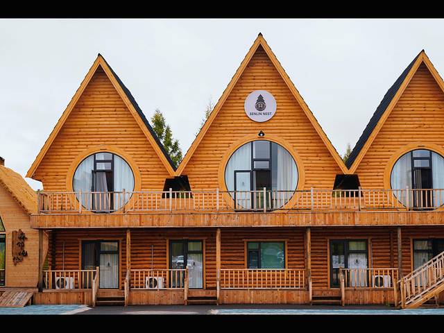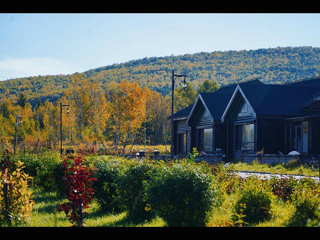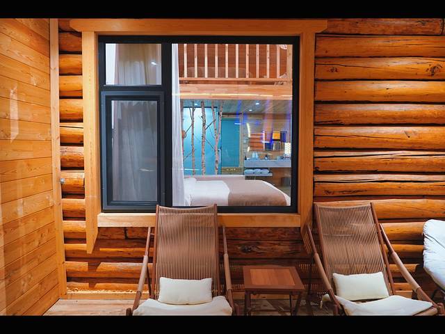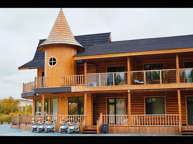 与其说是酒店,我更愿意称之为森林康养度假区。它是由原来的林场改造而成,被森林包裹着。一栋栋可爱的木刻楞排列整齐。