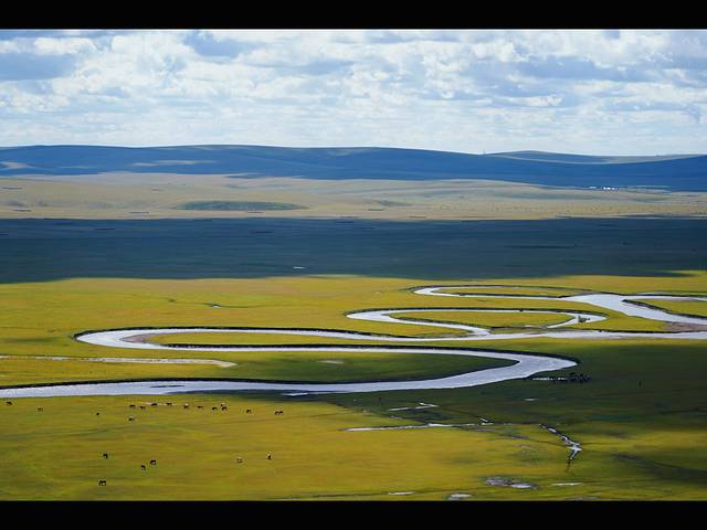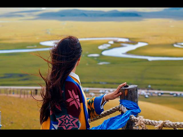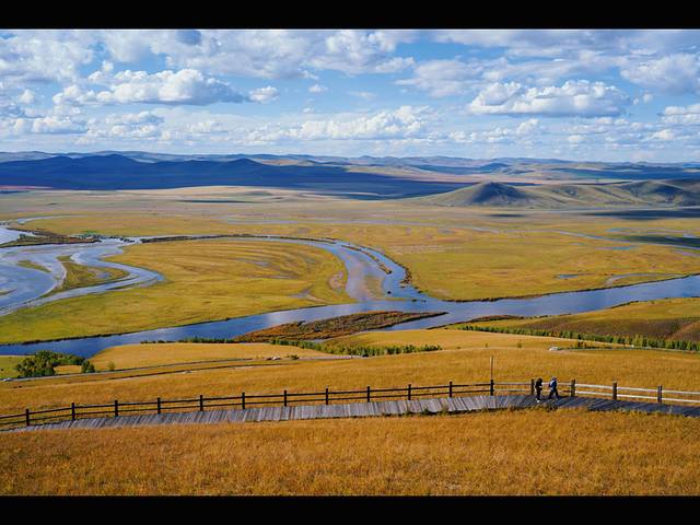 沿着木栈道登上观景台,我们看到河流像一条银丝带,在辽阔的草原上蜿蜒曲折,形成九曲回肠的壮美景色。
