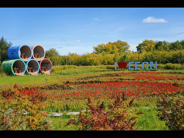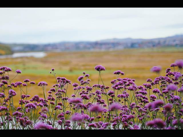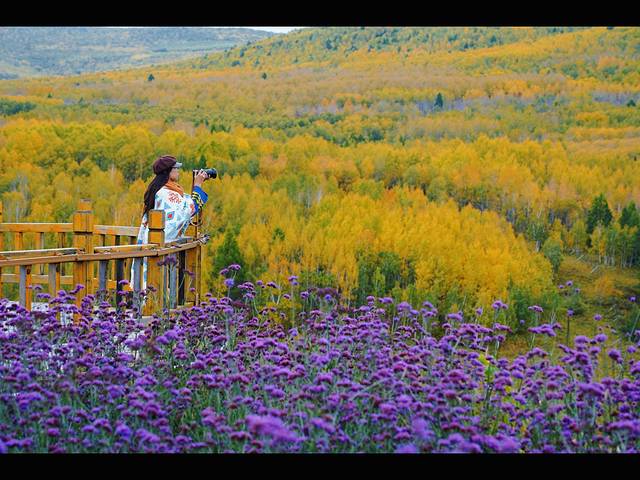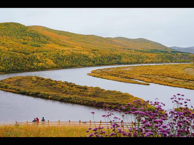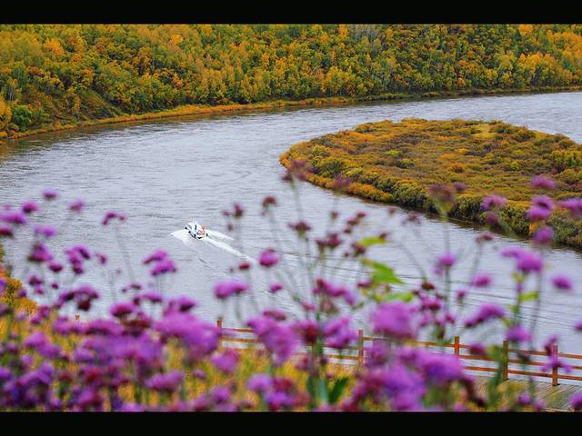 在一片黄绿交织的秋色中,紫色的花海显得格外醒目。不知道对岸的俄罗斯能不能看到?