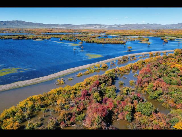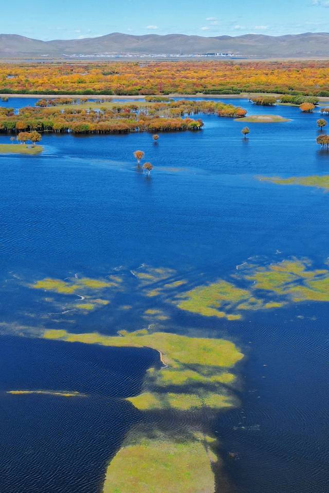 当无人机飞上去,我们看到了五彩斑斓的灌木丛,河水像蓝色丝带飘落其间。夕阳给这片湿地加了一层金色的滤镜,美得有些梦幻。