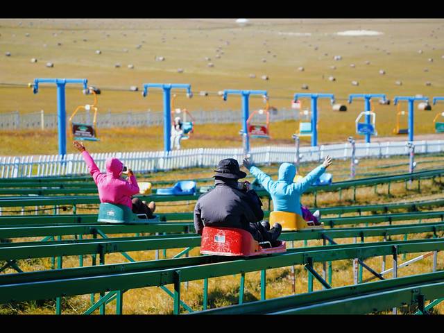 这里的主要体验是乘坐小火车环游草原,沿途设有几个停靠点,我们第一站停靠的是滑草项目。
