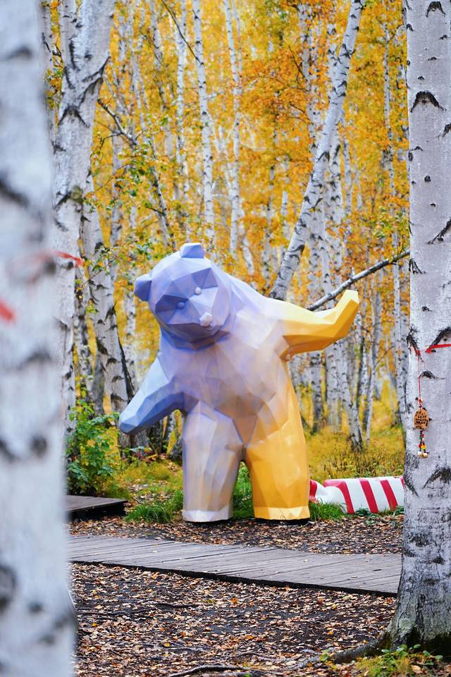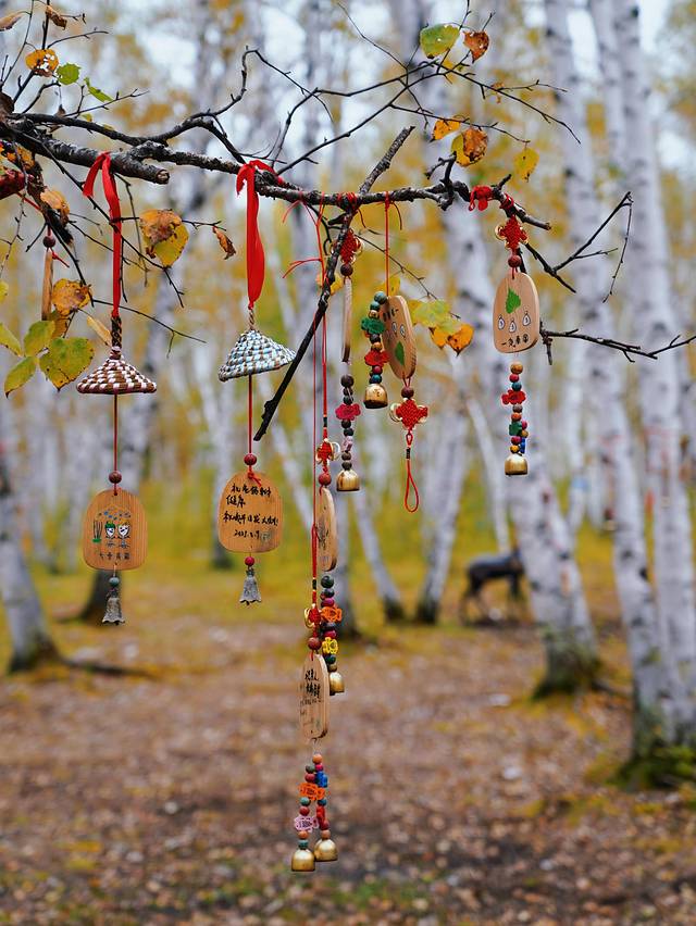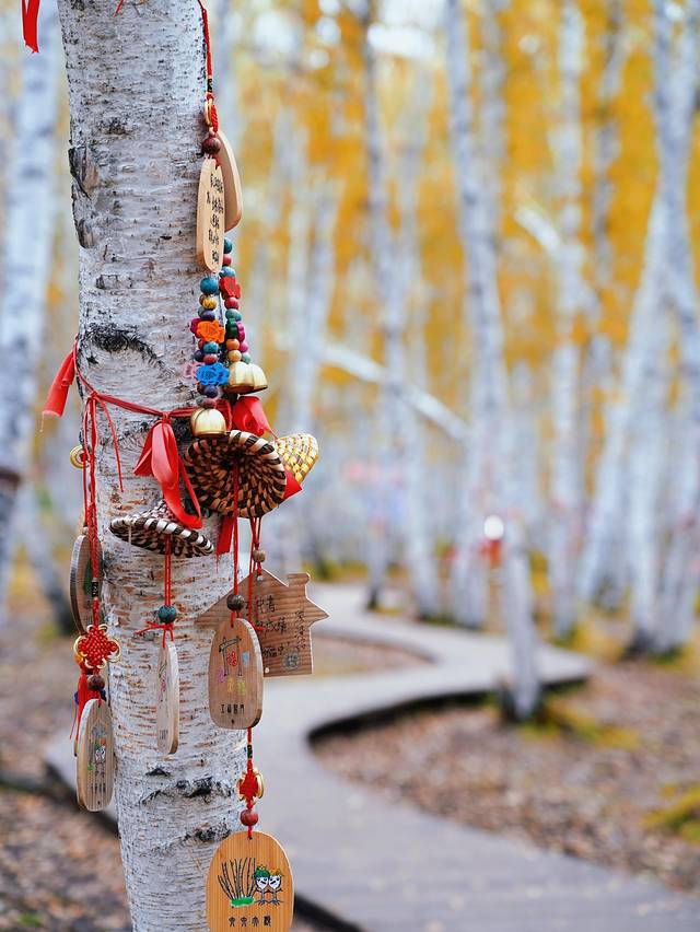 一走进景区就看到了大片白桦林。阳光透过树叶洒在地上,光影煞是好看。