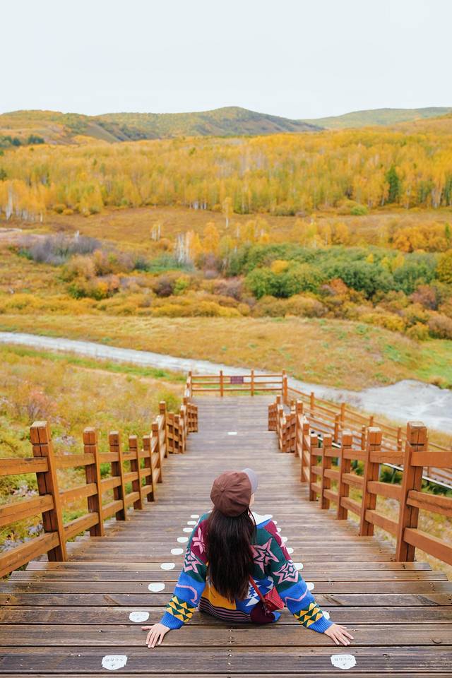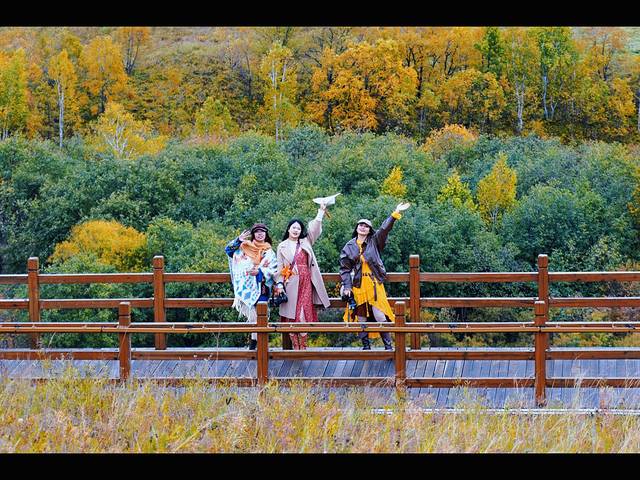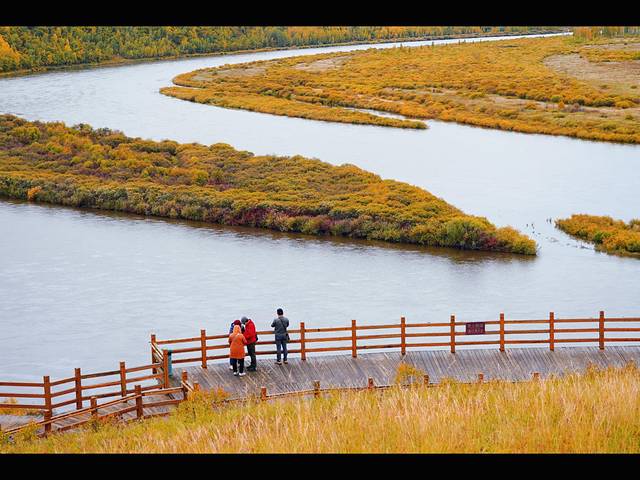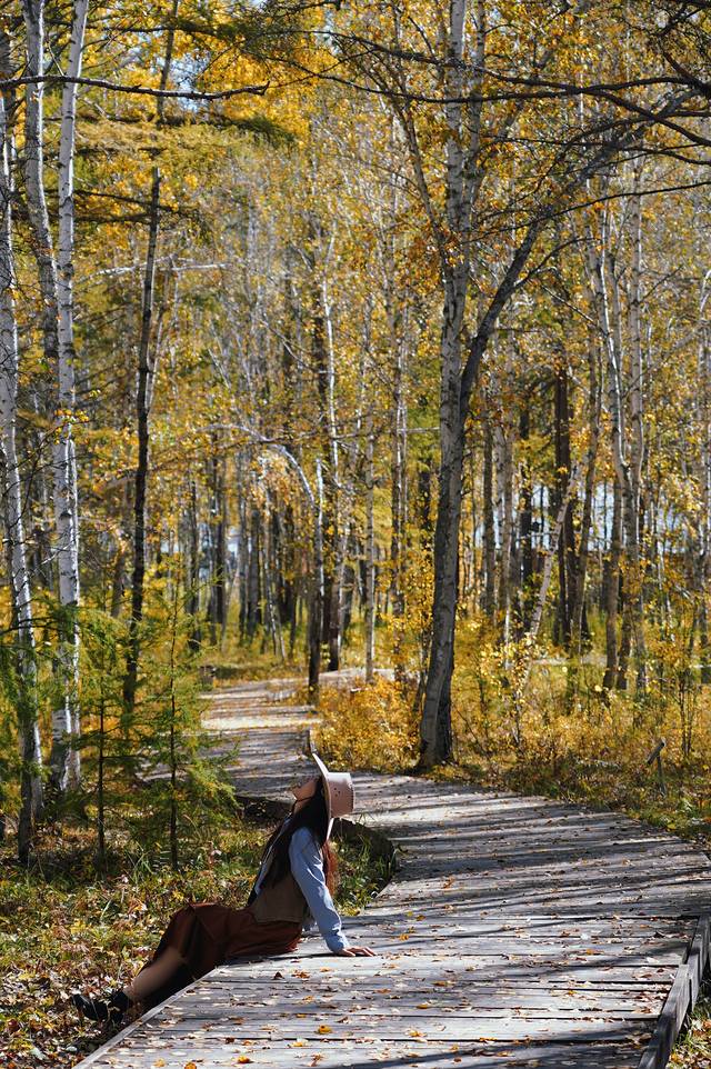 区别于额尔古纳湿地景区观景以俯瞰为主,这里是让我们走到湿地里面。园内秋色正浓,河流如血脉般穿梭其中,金黄的树叶倒映在河面,看起来把河水都“染色”了。