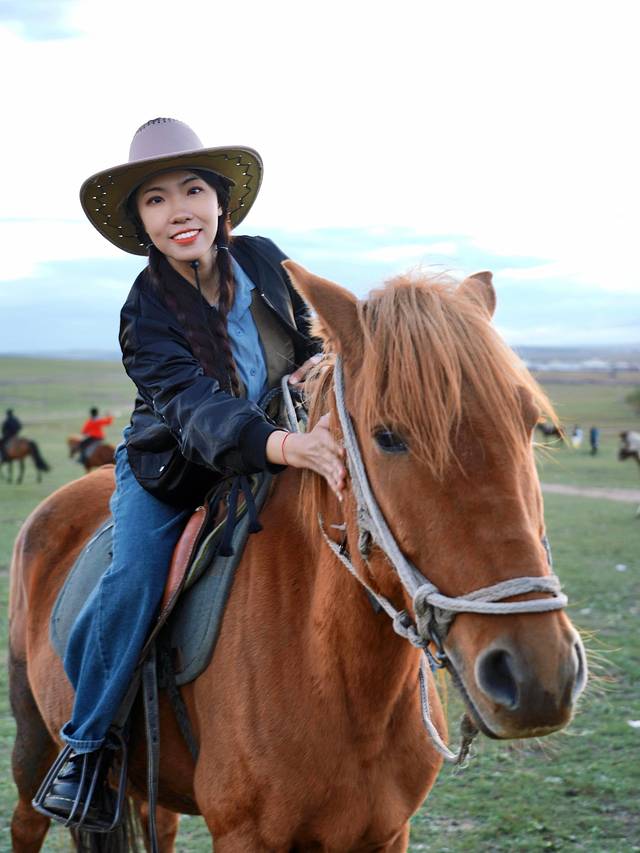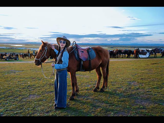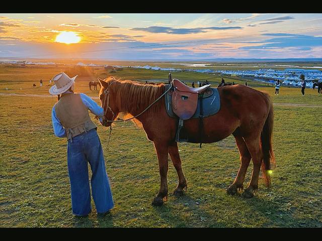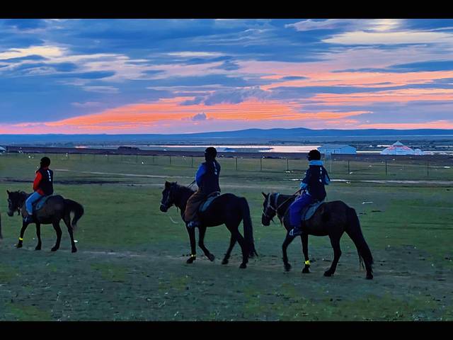 骑着马在草原上漫步,落日在身后追赶我们,余晖把马儿的身影拉得很长很长。到达目的地,正好迎上紫红色的晚霞。这一刻,感觉自己好像在电影里。