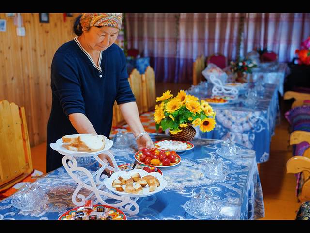 在这里,我们拜访了俄罗斯族家庭,品尝了主人家自制的俄式面包“列巴”和蓝莓酱,听他们讲述家族历史,听他们现场拉手风琴演唱俄语歌曲《喀秋莎》,最后还一起玩了他们的彩蛋游戏。