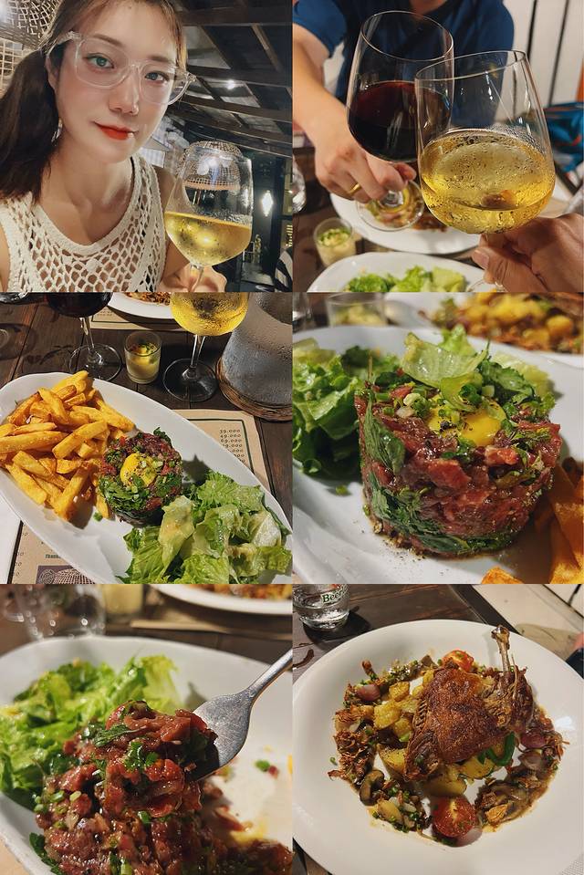 晚餐去了法国老板开的当地算很高档的牛排餐厅。点了招牌的300g牛臀肉65万,火腿芝士拼盘50克25万,happy hour 两款红酒两款干白,欢乐时光原价9.5万现在5万,一边喝酒一边享用美食真的吃的很好很舒服。