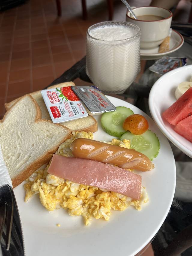回市区已经很晚了,在车站买了推车卖的姜片椰丝豆花,热乎乎的很好吃。中午就在车站旁的永珍早市买了烤五花肉和排骨,配糯米饭和牛油果椰子沙冰。