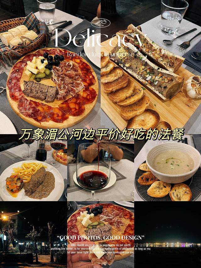 晚上去了湄公河边一家不错的法餐,人均100多的大餐,点了烤牛骨髓,芝士和几种火腿拼盘,超好吃的牛排和蘑菇汤等等,450ml的红酒配餐很不错。
