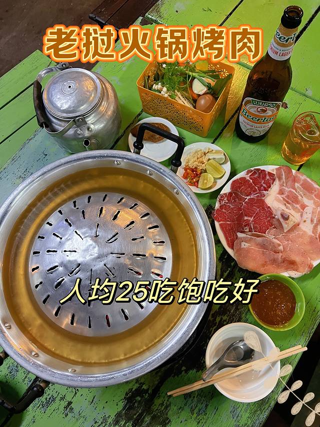 晚餐吃老挝火锅烤肉,两个人喝了两个老挝啤酒买单一共才20万,也太划算了。