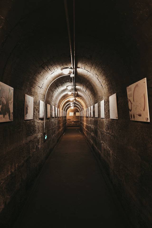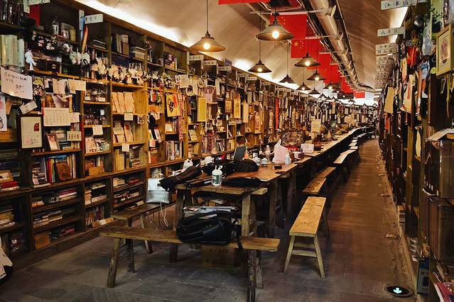 真正的震撼在穿过左边的拱门后降临。长达五十米的防空洞被改造成一座地下书城,顶天立地的书架塞满了上世纪的老物件:1983年的《红岩》杂志、1992的高考复习资料、泛黄的《大众电影》封面女郎......在《辞海》与《毛选》的间隙,还藏着许多老校徽,重庆大学、西南师范、四川美院的徽章在玻璃柜里闪着微光。