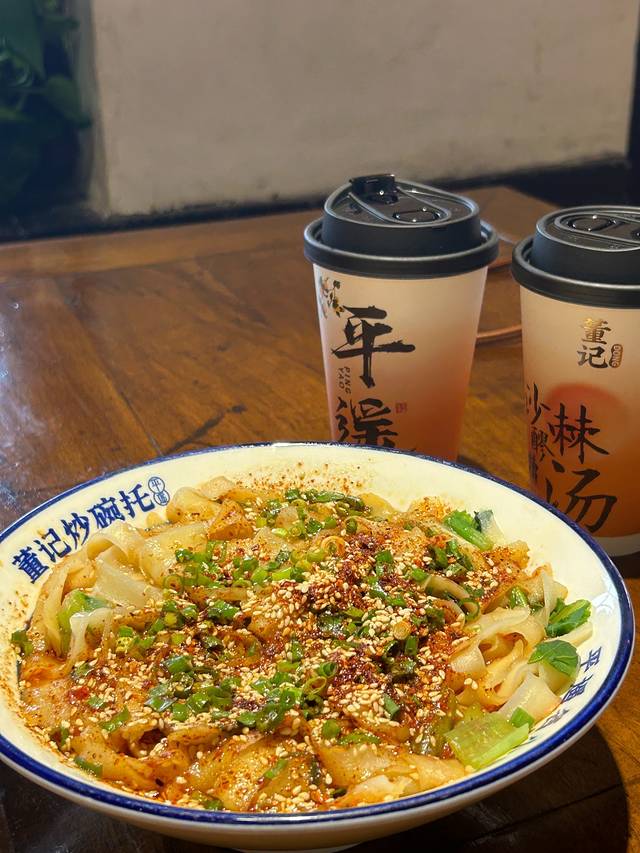 很有烟火气的 平遥 小吃店,早晨的阳光斜斜地照进店堂,照在木质的桌椅上,门口的大玻璃窗能直接观看师傅们正在炒碗托的身影他家以炒碗托为主,种类非常多,可以根据自己的喜好选择配菜,除了炒碗托,油泼刀削面真的太好吃了,筋道的面条,没有复杂的浇头,只是将辣椒、蒜末等铺在煮好的面条上,再浇一勺热油,滋啦作响间香味収刷喷涌而出!还有可以带走喝的沙棘醪糟汤,酸酸甜甜的