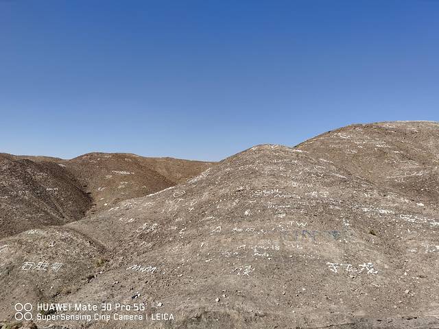 买好香梨后就向吐鲁番出发。这一路也没什么风景,经过的地方属于罗布泊无人区边缘,沿途基本都是无人区荒漠戈壁,中途没有任何人烟和补给,风特别大。但是我很奇怪,沿途无人区的山丘上和路边写着密密麻麻很多人的名字、爱情誓言和自我激励的文字,基本都是用白色小石子堆填而成,怎么会有这么多人这么有情趣在这无人区荒漠中留下这么多文字,这至少要好些年才能够形成这么多密密麻麻的文字,而且这么大的风,这些细小的石子也没有被吹散,依然保持着原有的字形,清晰完整。