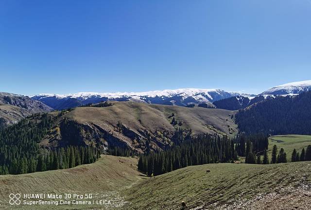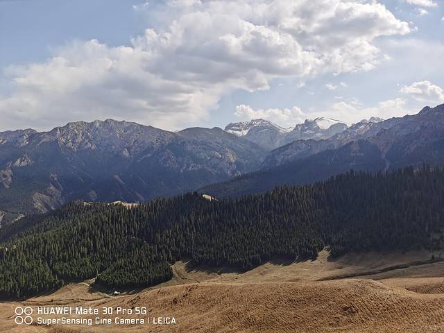 上了独库,首先经过的是盘山公路,要翻越高山,沿途是森林和远处的连绵雪山,风景不错。