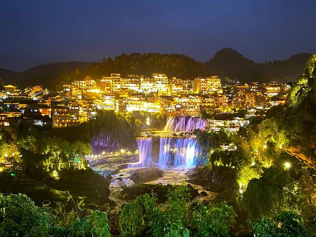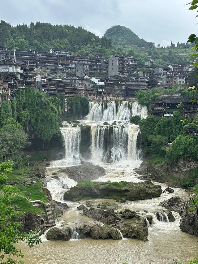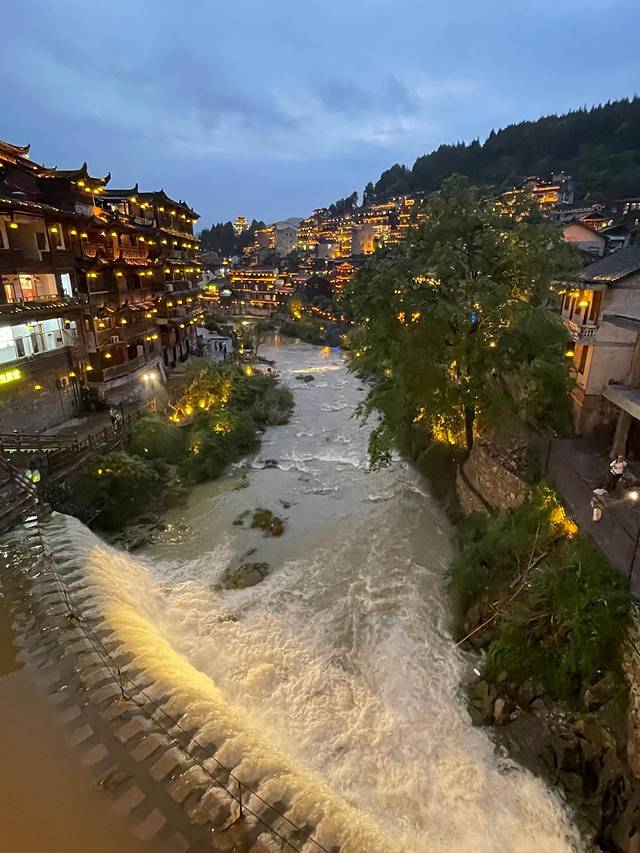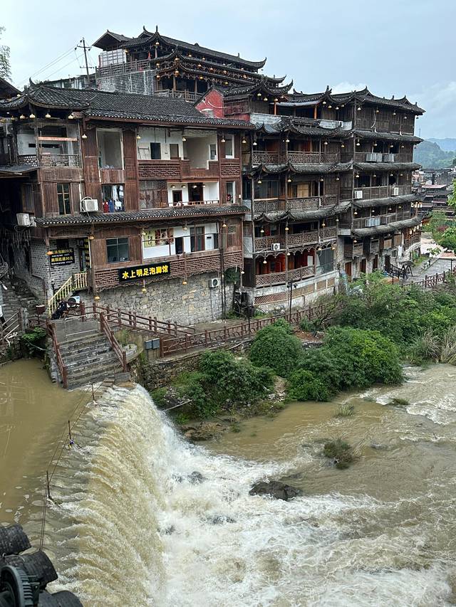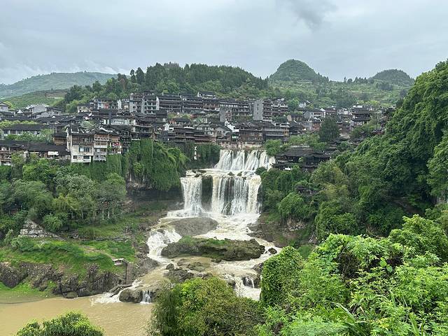芙蓉镇的自然景色也十分独特。一条壮观的瀑布让“八”字排开的古寨建筑高低错落更加自然和灵气,昨晚的一场大雨,瀑布染上黄色,无论白天和夜晚都更加奇妙。“你们运气不错,瀑布和古寨都是最好看的时候”,悬园民俗的主人说的没错。前不久刚刚去过黄果树大瀑布,芙蓉镇瀑布气势不凡,也能从瀑布中穿行,体验水帘洞之感,其他之美真有一拼哦!