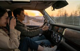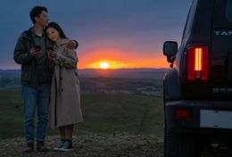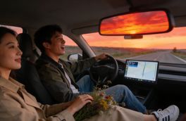 傍晚 6 点,自驾车行驶在夕阳下的公路,后视镜里映着晚霞,车内两人哼着歌,副驾座位上放着捡来的野花。傍晚 6 点,自驾车行驶在夕阳下的公路,后视镜里映着晚霞,车内两人哼着歌,副驾座位上放着捡来的野花。
