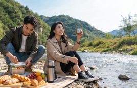 中午 12 点,在溪流边野餐,铺着格子餐布的石头上摆满面包、水果和保温杯,两人对着溪流举杯。
