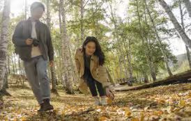 上午 9 点,抵达白桦林景区,两人漫步林间,阳光透过枝叶洒下斑驳光影,女生捡起一片金黄落叶。