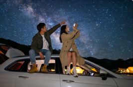 晚上 8 点,返程途中经过星空营地,车停在开阔地,两人打开天窗,仰望着满天繁星,手指着银河。