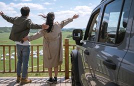 下午 2 点,草原观景台,自驾车停在木栅栏旁,两人张开双臂迎着风,远处是连绵的绿色草原和白色蒙古包。