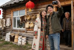 下午 4 点,探访鄂伦春民俗村,在传统木刻楞房前,女生尝试穿着民族服饰,男生为她拍照。