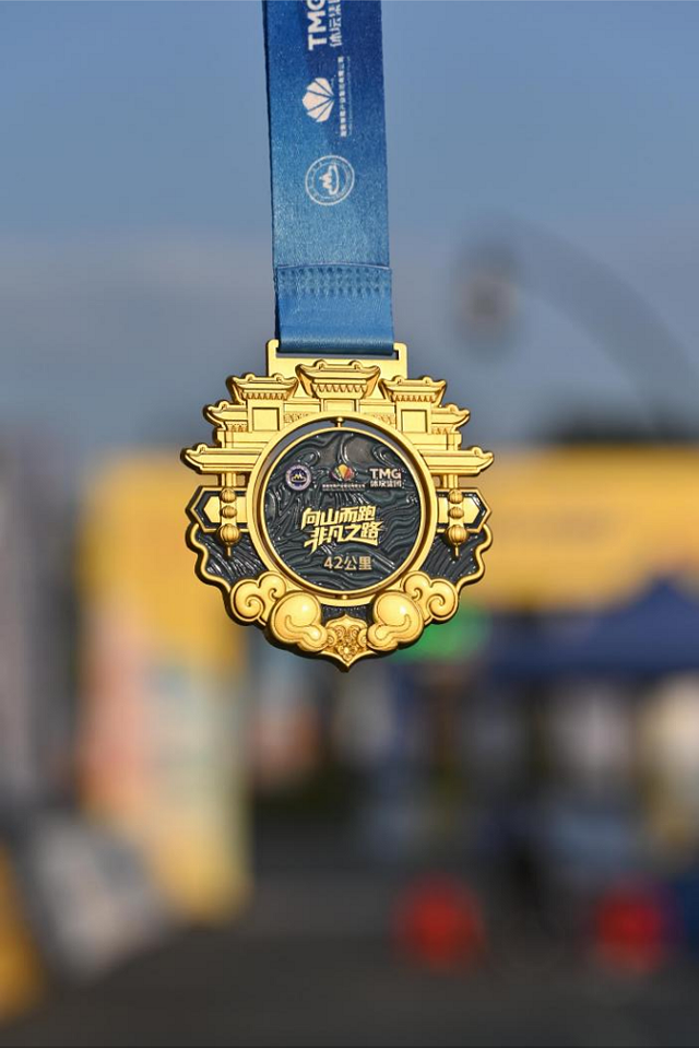完赛奖牌更是本次赛事递给选手的一张“岭南文化名片”。以“旋转互动赋能文化赛事”为设计核心,奖牌主体采用可旋转结构,正面整合从化地标文峰塔、梅花与广府古建筑群,具象化“山水从化”的地域基因与岭南建筑美学;云纹设计承载传统吉祥寓意,金色喻示完赛荣誉的厚重分量,蓝色呼应从化山水的自然底色;背面“向山而跑 非凡之路”的赛事主题、各组别标识清晰呈现,指尖转动间,岭南文化与越野精神交融共鸣。每一位完赛选手手握这枚奖牌,握住的不仅是对自我挑战的肯定,更是对从化人文底蕴的沉浸式感知。
