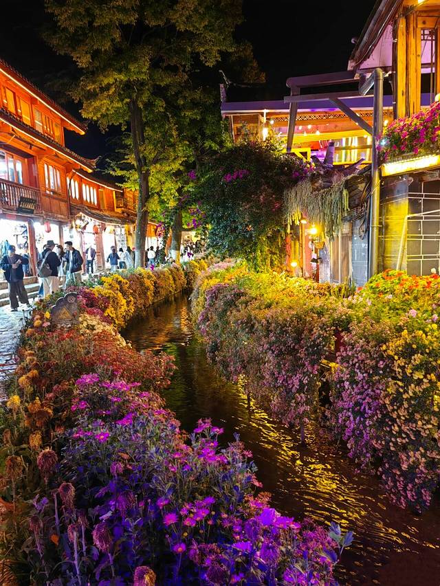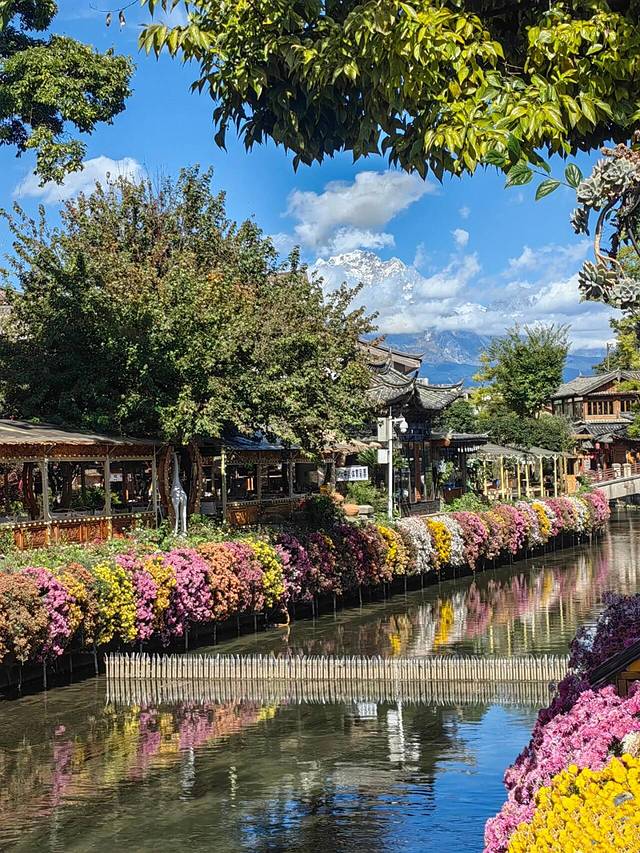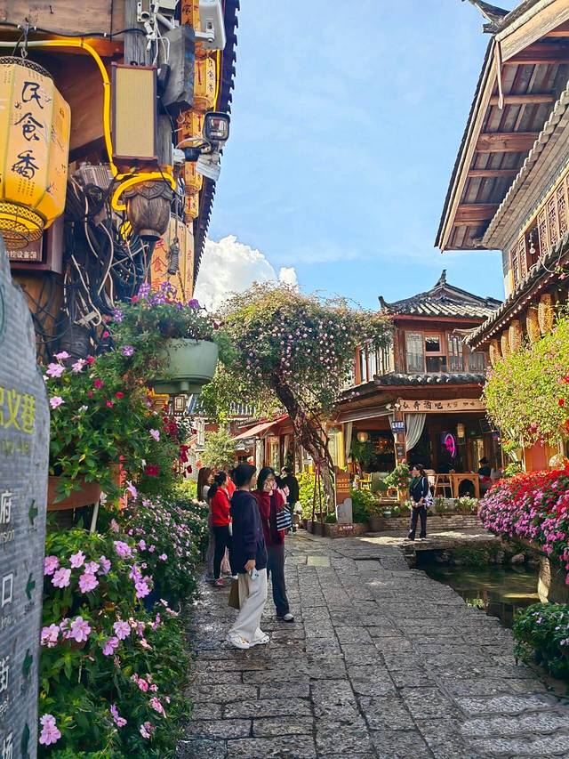 白天逛特别舒服:去忠义夜市附近,抬头能看见雪山尖儿躲在蓝天里,古城屋顶、路边的花、远处的雪,凑在-起就是我心里丽江该有的样子;四方街也建议去,水流清澈,花团锦簇。