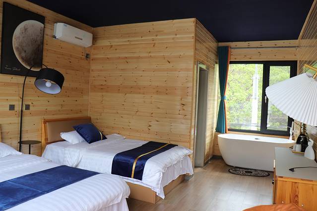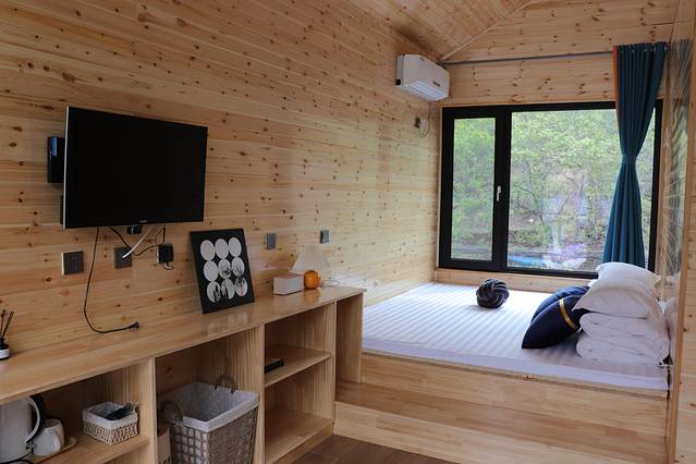 整体风格精美雅致,兼具生态田园风情与舒适质感。四周青山绿水环绕,空气清新,登高远望心旷神怡;特色纯实木俄罗斯乡村小木屋,自带山野自然气息。