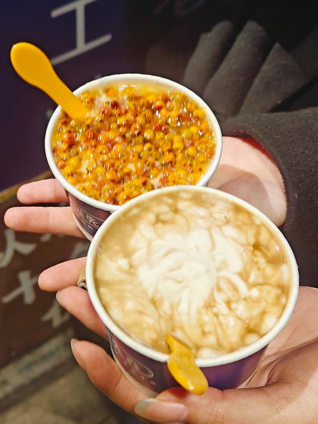 3、沙棘醪糟汤,里面还加了鸡蛋,酸酸甜甜的很开胃,和碗托是绝配!还是奶茶一样的杯子装的,可以边走边喝