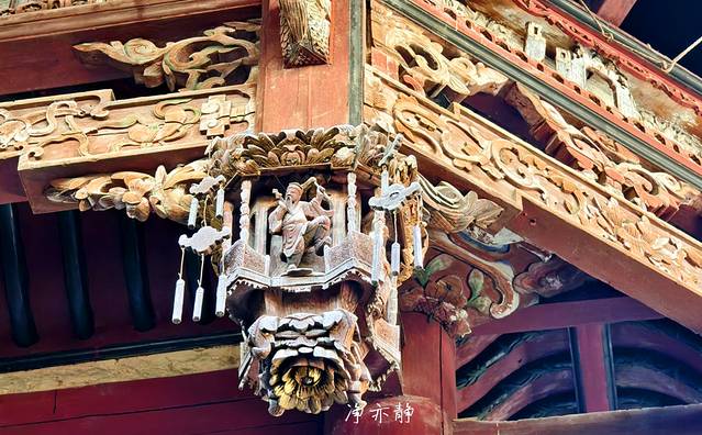青龙两边还有两位仙人,即道教里面的天官,一位手上拿着官帽,一位手上拿着爵,寓意天官赐福,加官进爵,也代表临水夫人,从唐至清经过帝王不断的加赏赐封,无论等级规制,还有封号都是越来越崇高的。