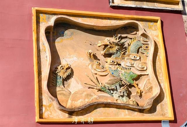竖额两边由两只四爪青龙簇拥着。在古代,皇宫里面的龙是五爪金龙,而四爪青龙则象征着等级规制仅次于帝王。