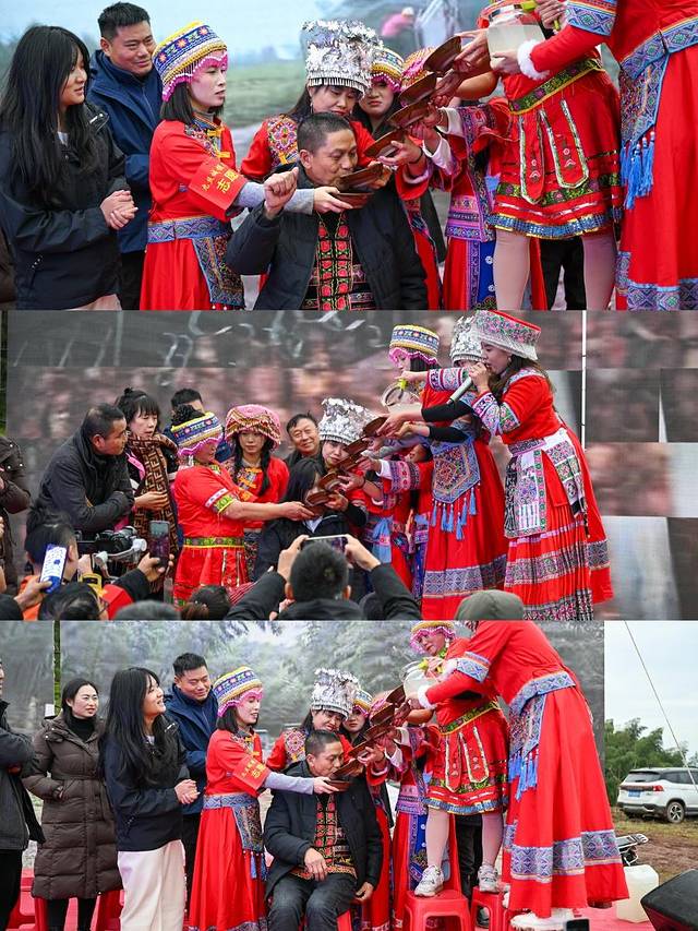 原始而热烈的生活气息充斥满院,更嗨的是“高山流水敬酒”。苗族阿妹们唱着祝酒歌,手持酒壶从高到低呈阶梯状排开,美酒如瀑布般层层流泻进客人的碗中。